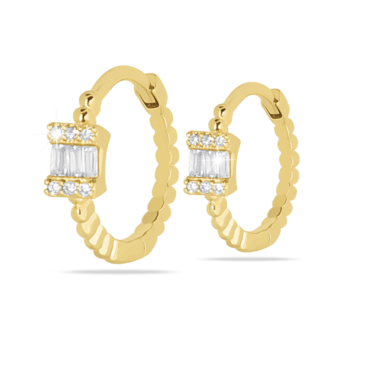 Aggiungi un po’ di brillantezza al tuo look con questi orecchini anallergici a cerchio dorati, impreziositi da pietre bianche scintillanti. Il contrasto tra il metallo lucido e le pietre luminose crea un effetto elegante e raffinato.