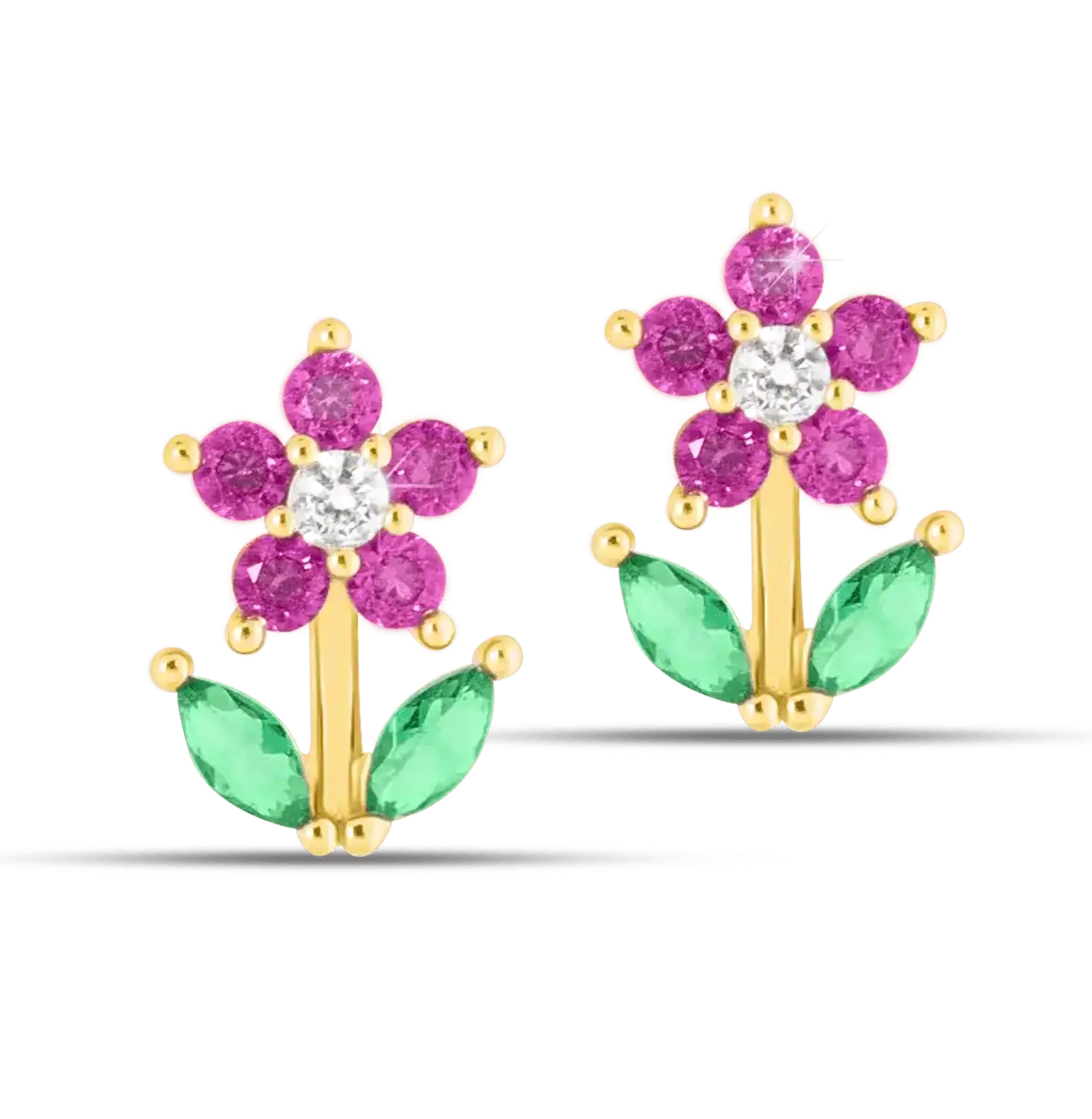 Delicati orecchini anallergici a forma di fiore con petali in zirconi fucsia e foglie verde smeraldo. Realizzati in acciaio chirurgico nickel tested con finitura dorata, catturano la luce grazie al cristallo centrale brillante.