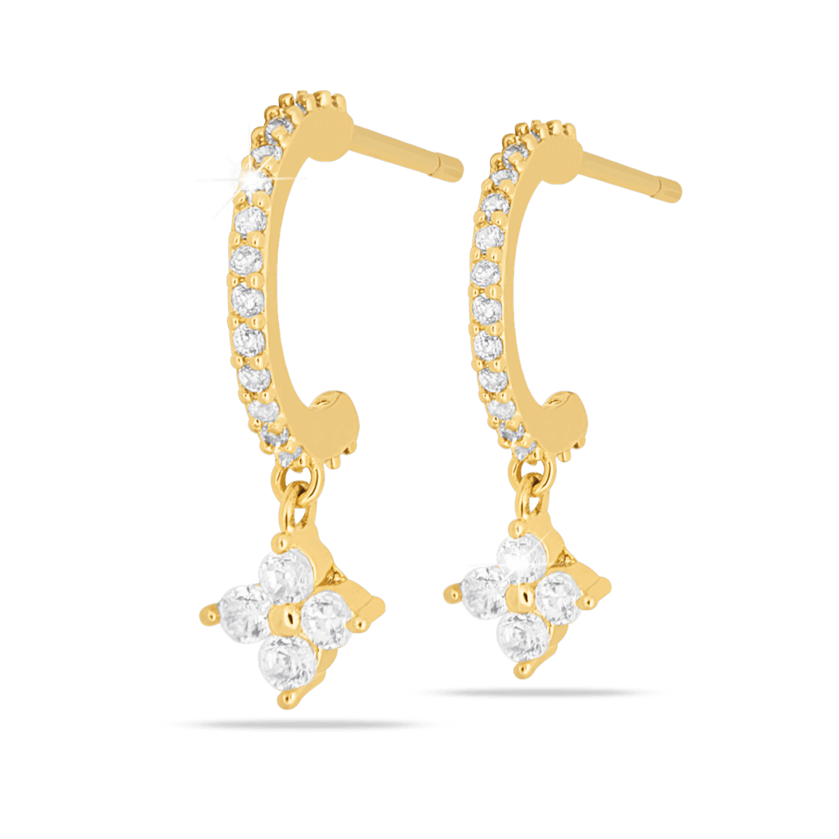 Questi orecchini anallergici a mezzo cerchio color oro con pendente di cristalli bianchi sono un vero spettacolo.