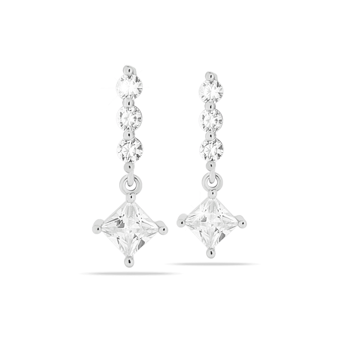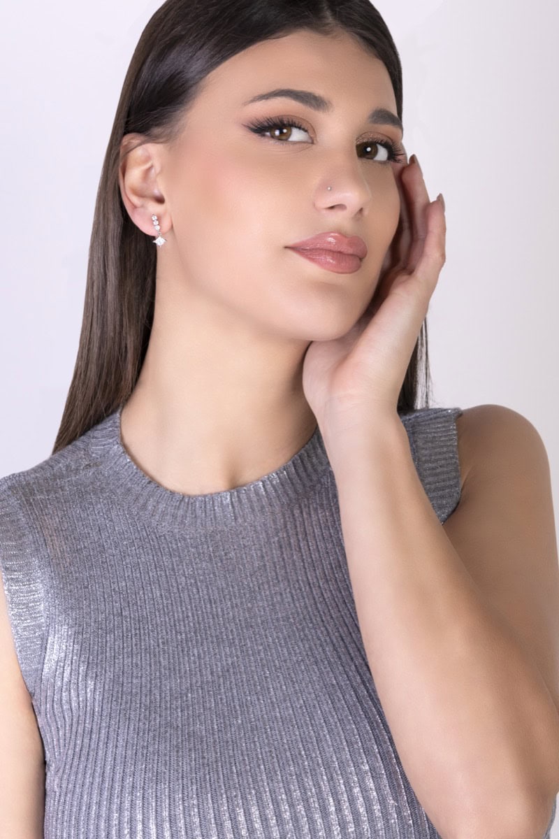 Delicati e raffinati, questi orecchini anallergici pendenti in acciaio chirurgico sono decorati con cristalli rotondi e una splendida pietra centrale a forma di rombo.